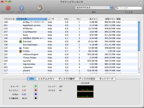 てあるのか?と思ったら、「Activity Monitor.app」とかいうのが、それにあたるらしい。なるほど、まさにそれですね。わかります。■ 参考URLhttp://mcd.blog3.fc2.com/blog-entry-354.html